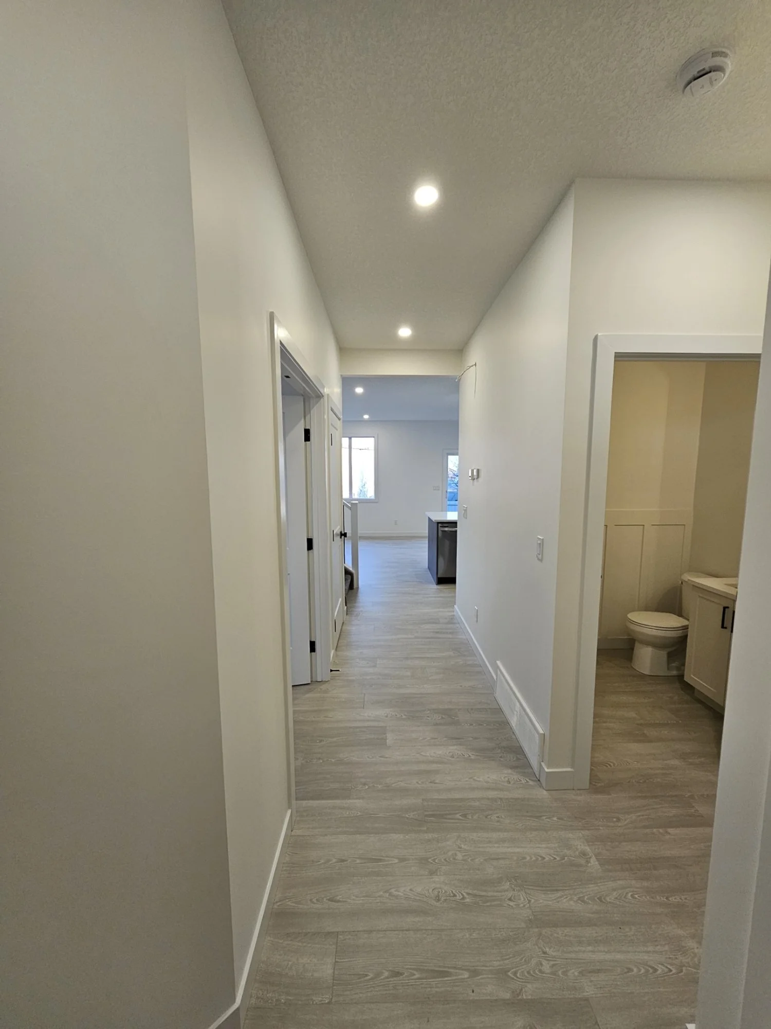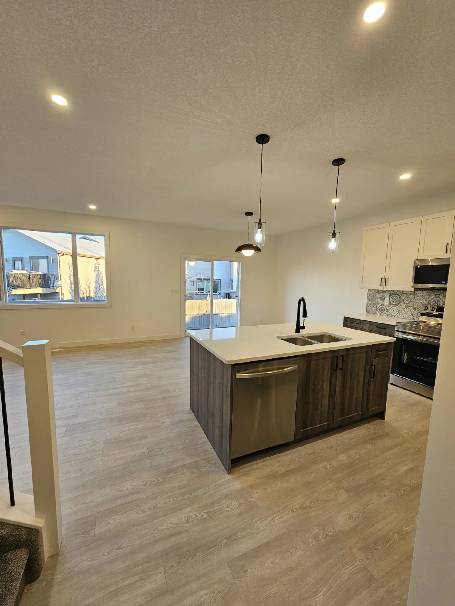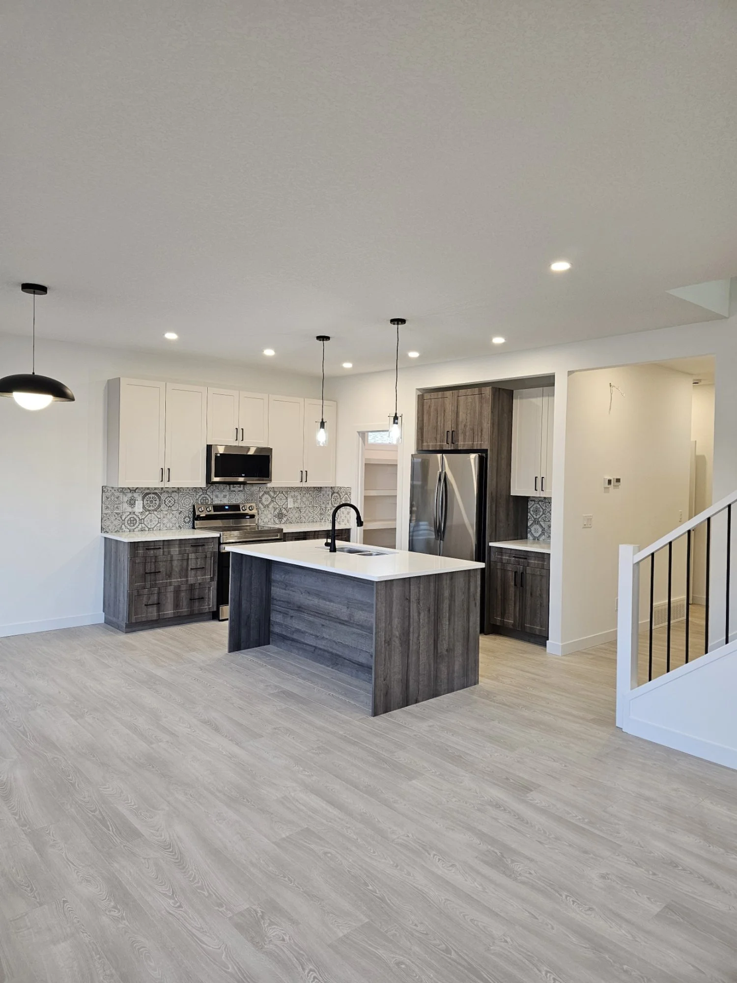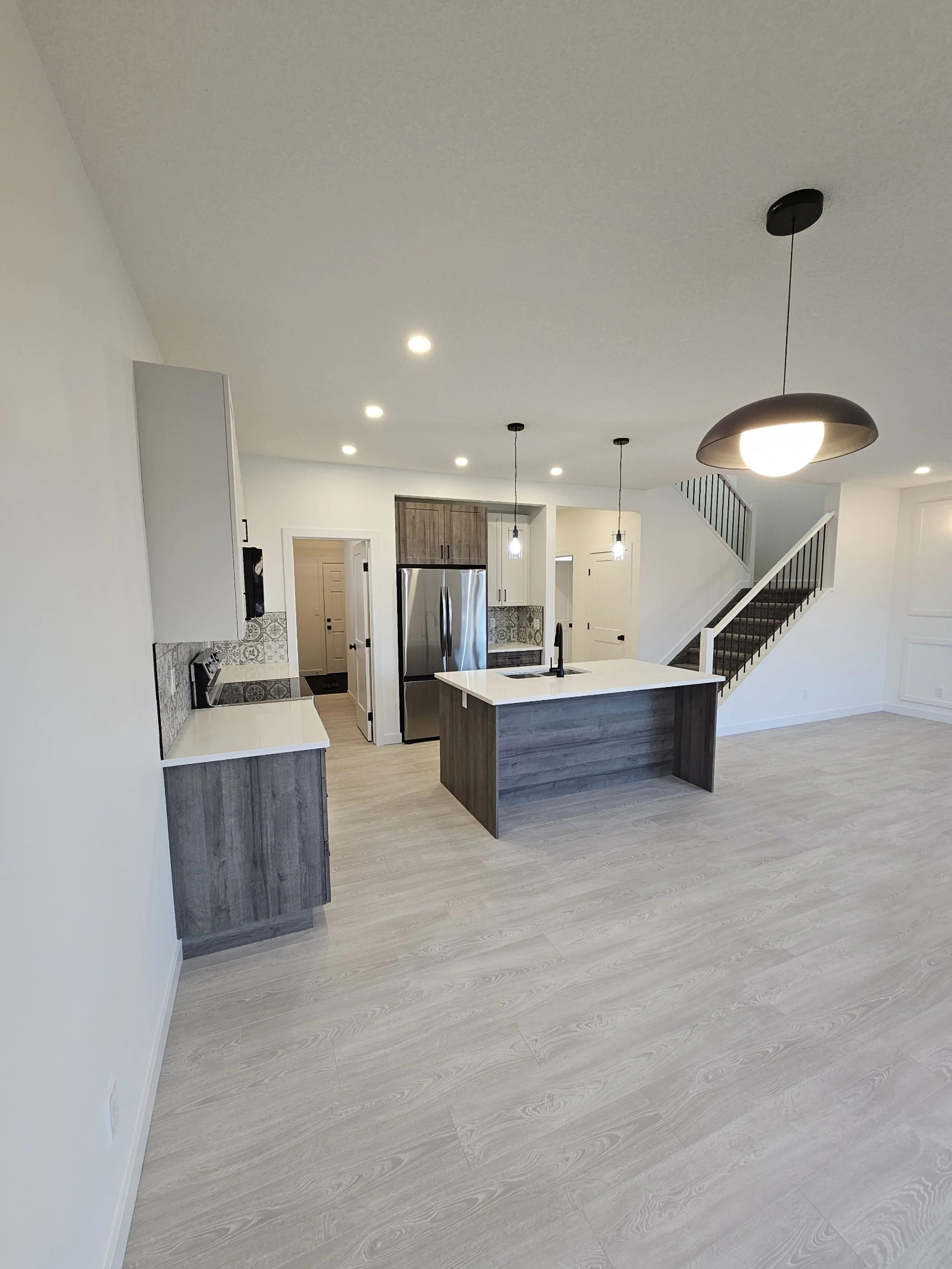 This beautifully finished two-story home complete with over 1853 ft. and a double attached garage. The main floor features a spacious entry way, a walk thru pantry, and an open concept living, dining room and kitchen with quartz countertops throughout. This beautiful property features 3 bedrooms on the second floor and a main floor den. The large master bedroom has an ensuite with a full 5 foot shower, tub and double vanity as well as a spacious walk in closet. The home also boasts a second-floor laundry. The basement is a full 9 feet and ready to add an in-law or rental suite with a side entry. At the current stage there is still the ability to add your personal touches.